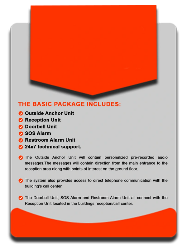 > Provides the delivery of pre-recorded audio messages regarding access to the main entrance, points of interest on the ground floor - directions, distances, etc.